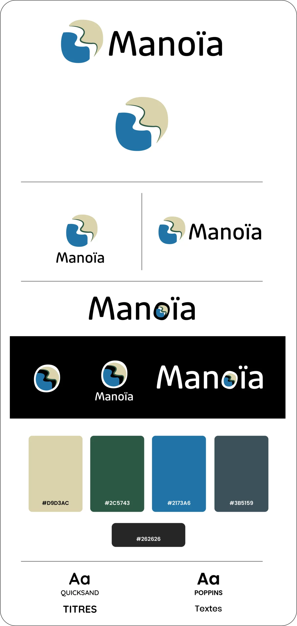 Plusieurs propositions de logos et déclinaisons graphiques ont été élaborées, offrant différentes pistes visuelles avant d’aboutir à une version finale alignée avec l’esprit de l’association. Ce processus itératif a impliqué des échanges réguliers pour affiner les choix et assurer une identité visuelle fidèle à la personnalité de Manoïa.